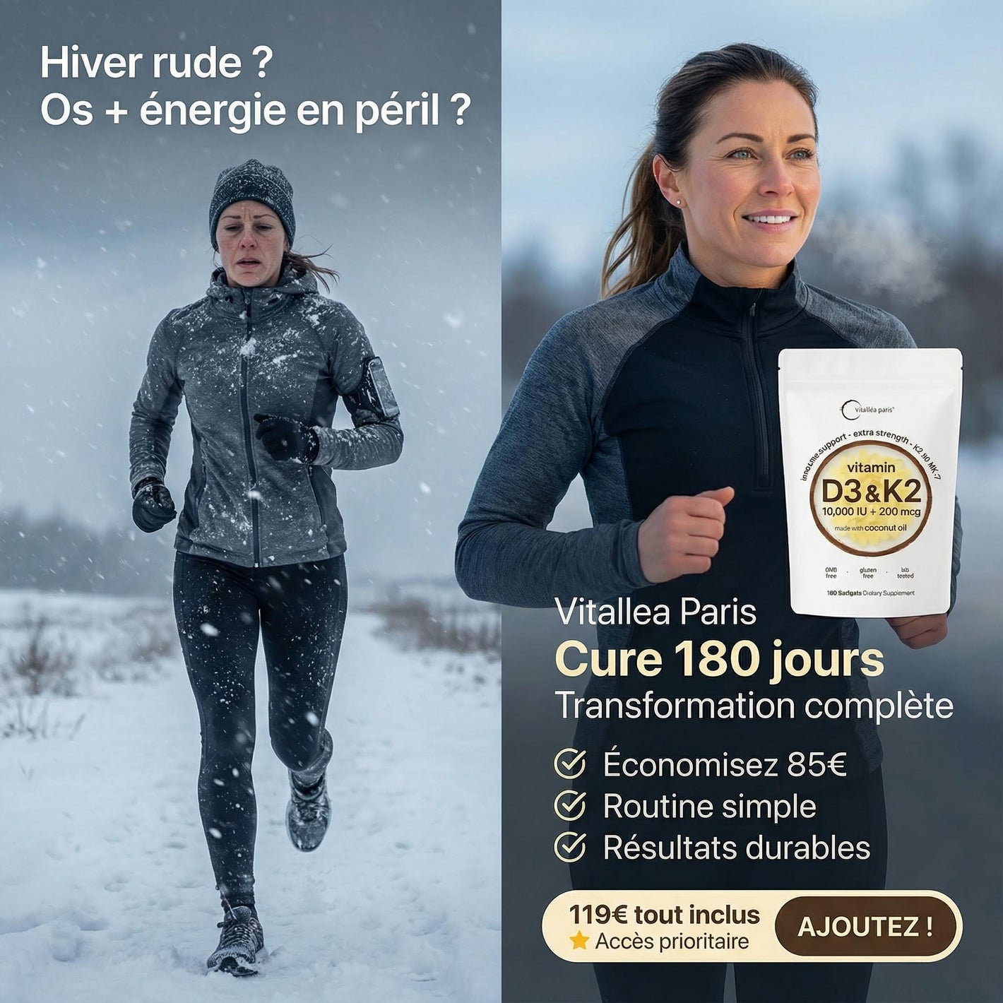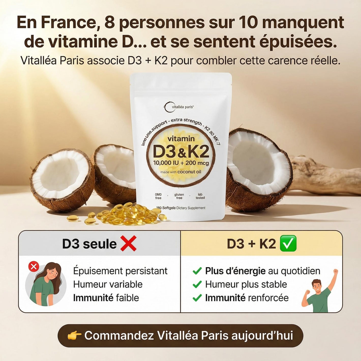 En France, 80% des adultes présentent une carence en vitamine D dès l’automne (ANSES 2023). Chez les femmes de 30 à 55 ans, ce manque s’accompagne souvent de fatigue, douleurs articulaires et inquiétudes pour la santé osseuse. -